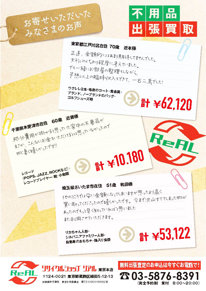 リユース可能な物でしたら、ほぼすべての品の買取が可能です。ご不要になった物がありましたら、まずは無料査定をご利用ください!