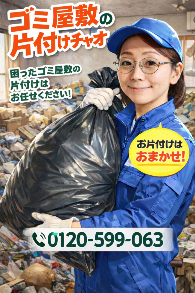 ホーム 不要品回収・買取 作品紹介・遺品/生前整理・お墓じまい 各種作業代行 ブログ お問い合わせ ブログ 🚨 ゴミ屋敷・汚部屋で今すぐ困っている方へ! 今日中に片付けたい方、緊急対応します! 今すぐお電話ください → ☎ 0120-599-063 (24時間365日受付) 立ち会いなし・秘密厳守・即日対応可能。 2026年1月7日 « 前の記事へ 次の記事へ » 最近の投稿 エアコンクリーニングは片付けチャオにおまかせ下さい✨ 🚨 ゴミ屋敷・汚部屋で今すぐ困っている方へ! 遺品整理・生前整理は【片付けチャオ】 【八潮市】ゴミ屋敷清掃の作業実績 🧹【作業実績・八潮市】2DKゴミ屋敷清掃 アーカイブ 2026年1月 2025年12月 2025年11月 2025年9月 2025年8月 2025年7月 2025年6月 2025年4月 2025年3月 2025年2月 2025年1月 2024年11月 2024年10月 2024年9月 2024年8月 2024年7月 2024年6月 2024年5月 2024年4月 2024年3月 2024年2月 カテゴリー エアコンクリーニング お知らせ ゴミ屋敷清掃 ブログ 不用品回収 遺品整理