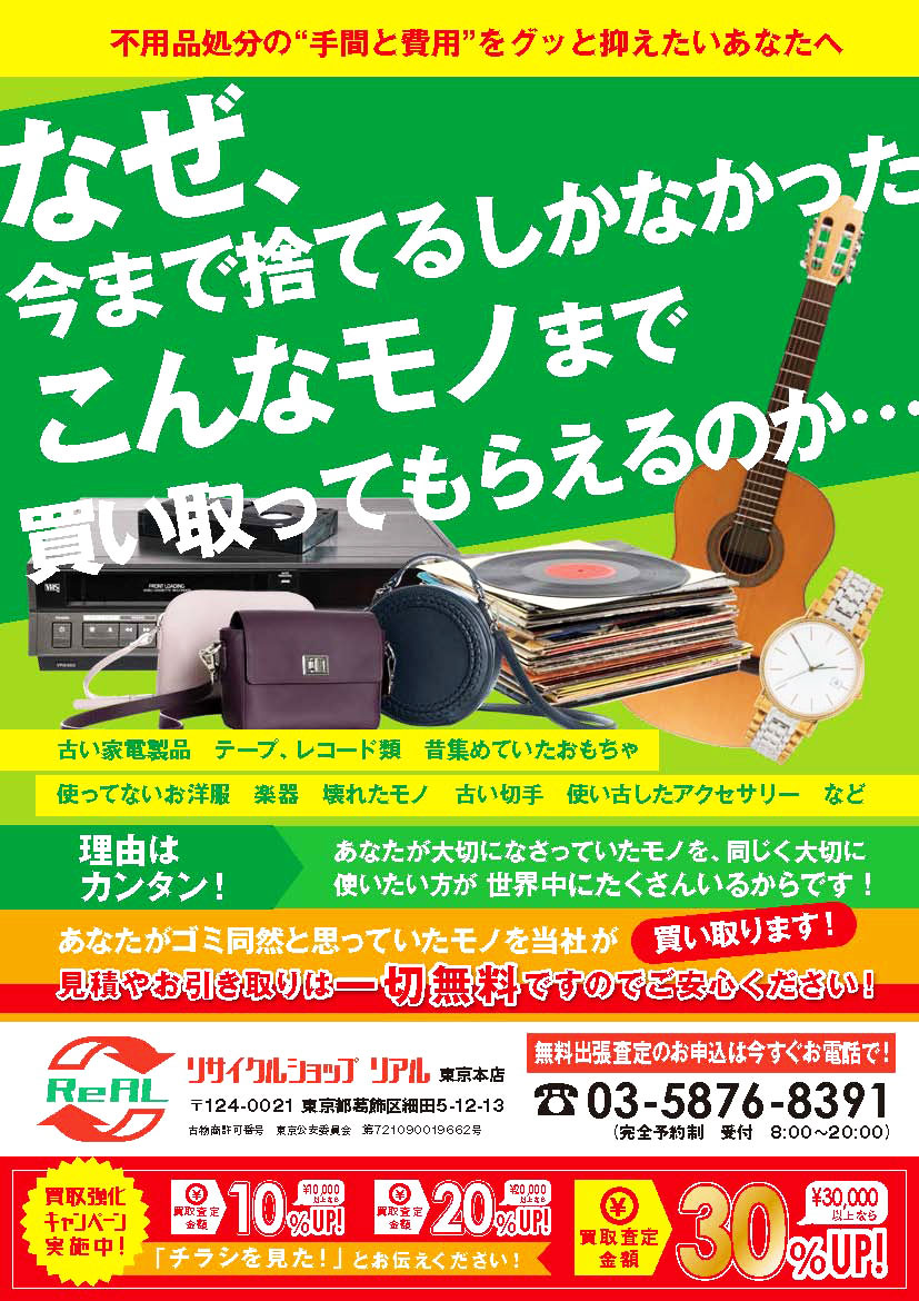 リユース可能な物でしたら、ほぼすべての品の買取が可能です。ご不要になった物がありましたら、まずは無料査定をご利用ください!